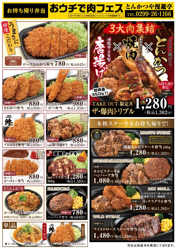 また現在、「総肉量350g!とんかつ・焼肉・唐揚げ全部のせ」のTakeOut限定丼「ザ爆肉トリプル」を販売中です。漫遊亭自慢の肉メニュー3品の超強力肉コラボを是非お召し上がりくださいませ。